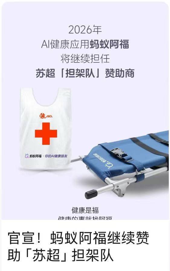 不少网友问,去年贡献了很多笑料的担架队官方赞助商AQ还在吗?记者查询后发现,去年场上第十四支队伍担架队赞助商AQ延续,今年升级为“蚂蚁阿福”,仍然是2026年“苏超”官方赞助商,与苏超同行。